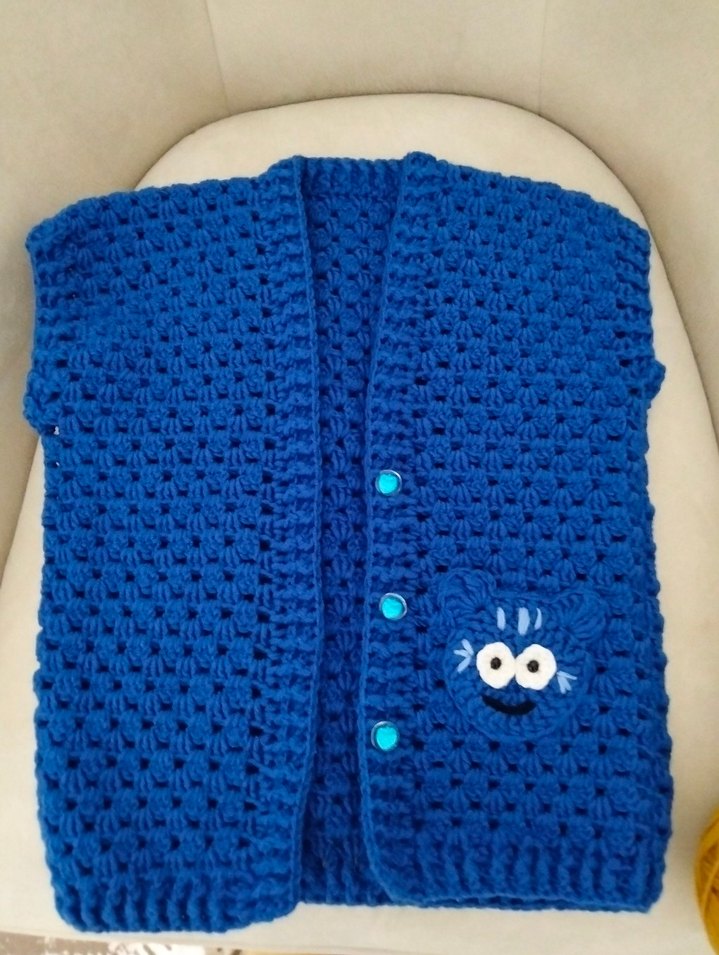 Erkek çocuklar için kolsuz, mavi örgü süveter, bol kesim ve renkli nakış detayıyla rahat ve gündelik bir tarz sunar.