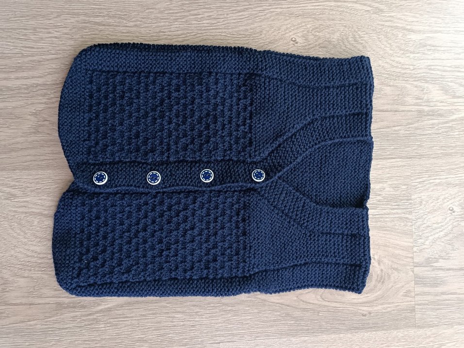 kısa kollu, regular fit erkek çocuk mavi örgü yelek. Düğmeli, desensiz tasarıma sahip örme kumaştan yapılmıştır.