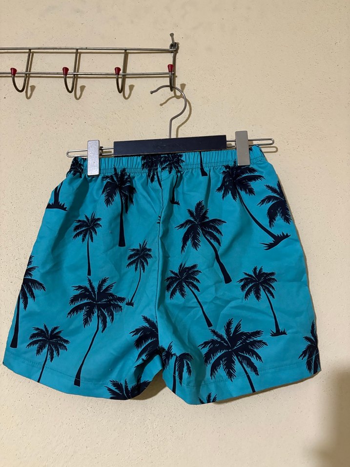 Erkek çocuklar için, elastik bel bantlı ve hızlı kuruyan kumaştan yapılmış, mavi zemin üzerine palmiye deseni bulunan renkli deniz şortu.