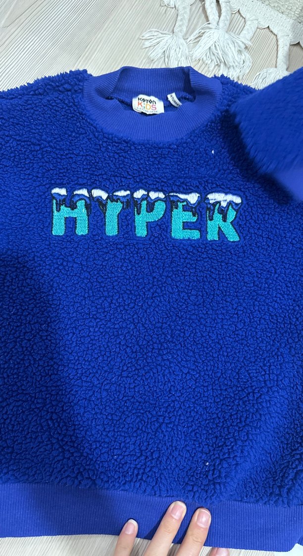 Erkek çocuklar için uzun kollu, bisiklet yaka ve fitted kesime sahip mavi peluş sweatshirt. Renkli baskılı harfler ve kürk detayları bulunur. Trend sokak stili için uygundur.