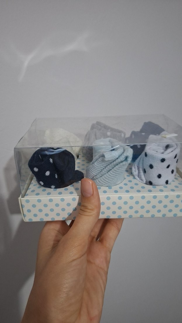Bu set, açık mavi tonlarda, puantiyeli desenli üç çift erkek çocuk çorabı içerir, yumuşak ve rahat kumaştan üretilmiştir. yeni doğan sıfır ürün 6 adet