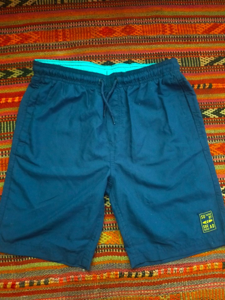 Erkekler için mavi, bol kesim, lastik kemerli şort. Plaj kullanımı için uygun, cep detayı bulunur. ölçüleri bel: 35 cm boy:43 cm 10-12 yaş çocuk için uygun, iyi durumda . Marka temsili