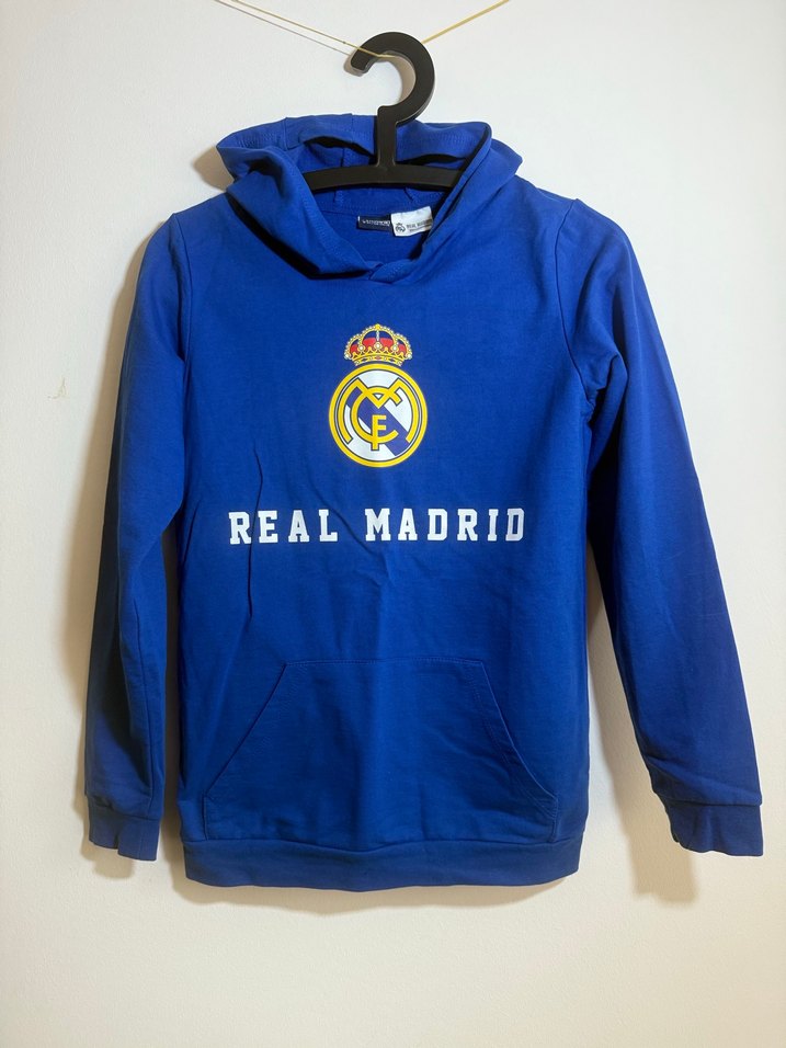 Mavi renkli, uzun kollu ve bisiklet yaka erkek çocuk sweatshirtü, yumuşak örme kumaştan ve bol kesimdir. Önünde renkli Real Madrid baskısı bulunur. Kumaşı orta kalınlıkla.