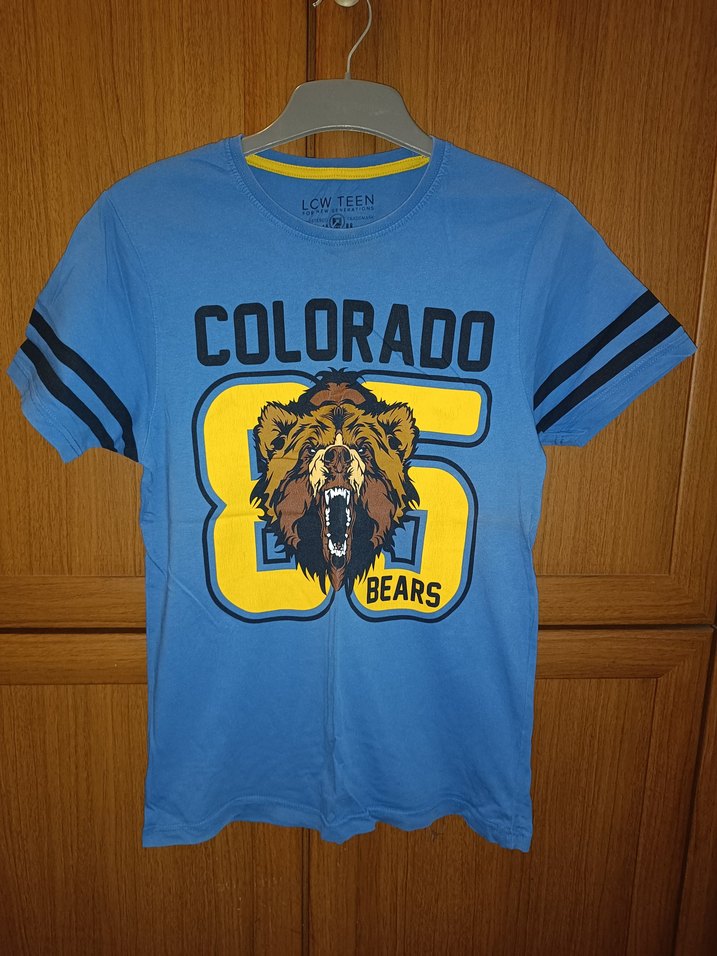 Erkek çocuklar için mavi kısa kollu tişört, renkli baskılı ayı ve "COLORADO BEARS" yazısı içerir. Yuvarlak yakalı ve rahat kesim, yumuşak ve sıcak kumaştan yapılmıştır.