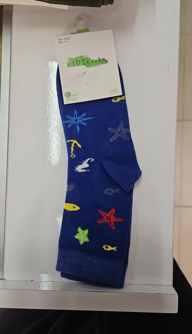 Mavi renkli, renkli deniz yıldızı ve balık desenli erkek çocuk çorabı. Yumuşak pamuklu kumaş rahatlık sağlar. 5-7 yaş için uygundur