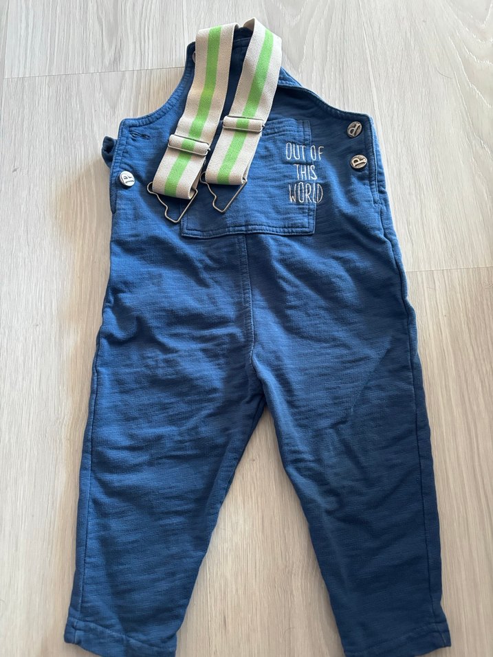 Erkek çocuklar için koyu mavi kot salopet, bol kesim, tokalı çizgili askılar ve düğmeli detaylar içerir. Göğüs cebinde 'Out of This World' yazısı bulunur.