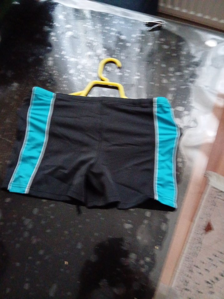 Erkek çocuk için koyu mavi renkli, yanlarında parlak mavi şeritler bulunan rahat mayo şortu.