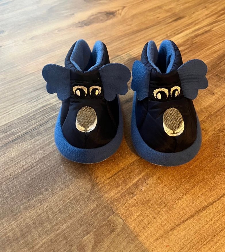 Erkek çocuklar için yumuşak, hayvan figürlü mavi sıcak ev terliği.