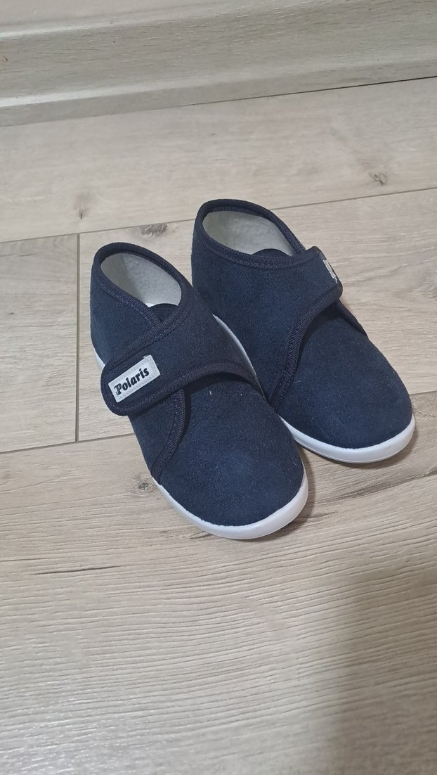 Erkek çocuklar için mavi renkte, sıcak tutan kumaştan yapılmış, kaymaz tabanlı ve velcro bantlı ev terliğidir.