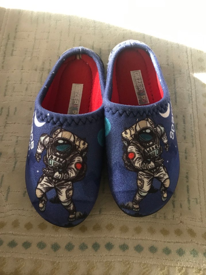 34 numara Erkek çocuklar için mavi, renkli astronot desenli, sıcak terlikler. Yumuşak ve sıcak kumaştan üretilmiştir.