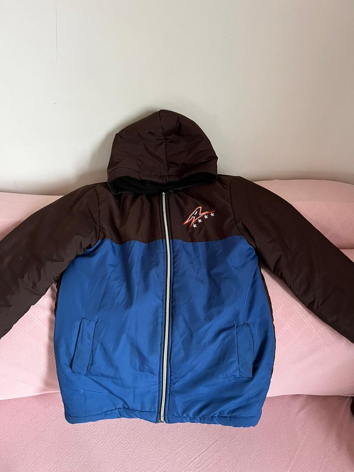 Fermuarlı ve kapüşonlu, koyu mavi ve kahverengi renk bloklu, erkek çocuklar için fitted kesim street wear mont. İki cep ve yakası notched lapel tarzında. tertemiz kullanıldı