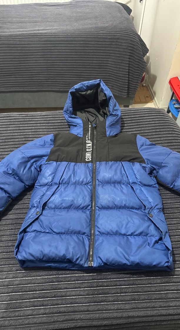 Fermuarlı ve kapüşonlu, yumuşak ve sıcak kumaştan yapılmış, lacivert ve siyah renklerde, sokak tarzı uyumlu erkek çocuk montu.