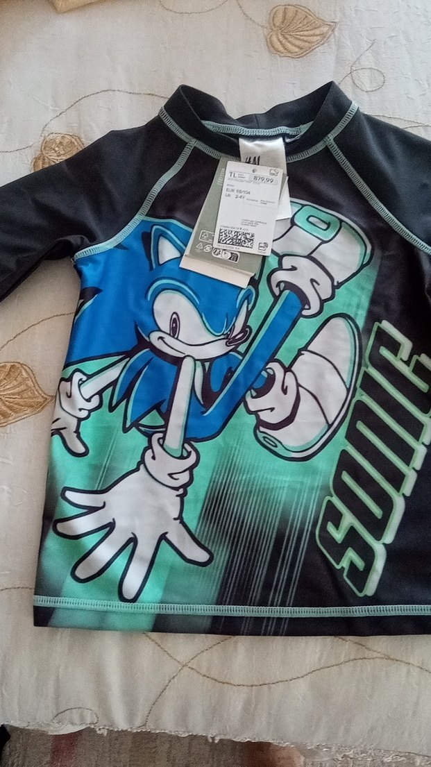 Koyu mavi sentetik kumaştan, uzun kollu ve dar kesim erkek çocuk tişörtü. Crew neck yakalı ve canlı Sonic baskılıdır. Velcro detayı vardır.