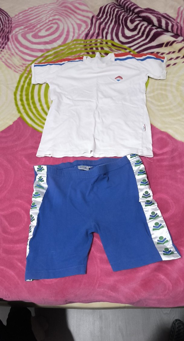 Erkek çocuklar için beyaz kısa kollu, omuzlarında renkli çizgiler ve küçük logolu tişört ile yanları desenli mavi şort takımı.