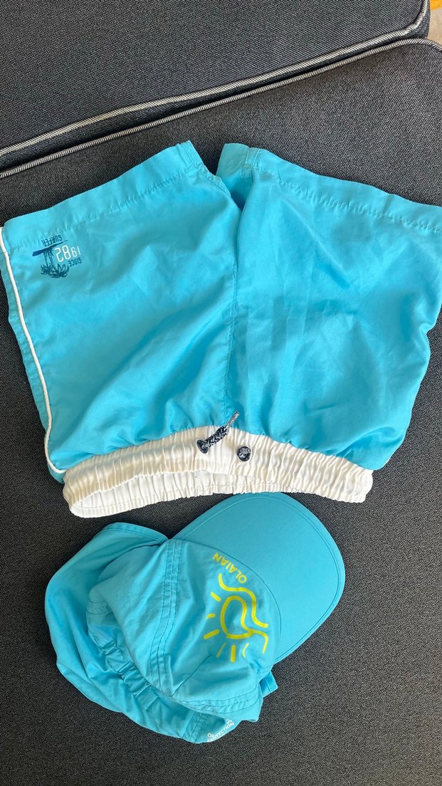 Decathlon şapka , şort hediye Açık mavi renkli, lastikli bel bantlı erkek çocuk yüzme şortu ve güneş desenli uyumlu şapka seti. Rahat ve sade tasarım yüzme giysisi.