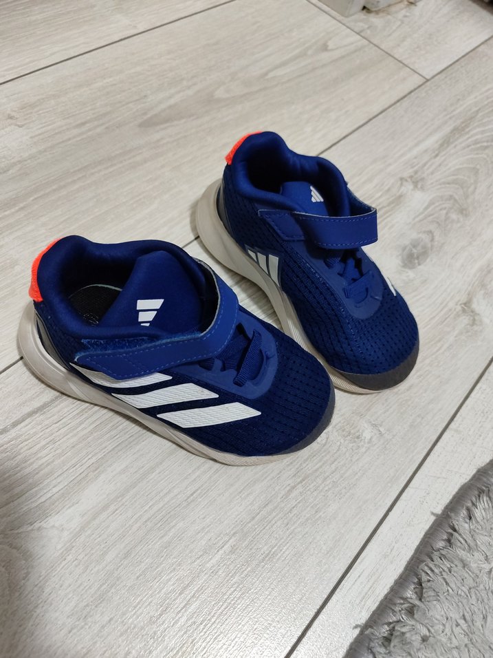 Mavi renkli, baskılı desenli erkek çocuk spor ayakkabısı, velcro bantlı ve kauçuk tabanlıdır.