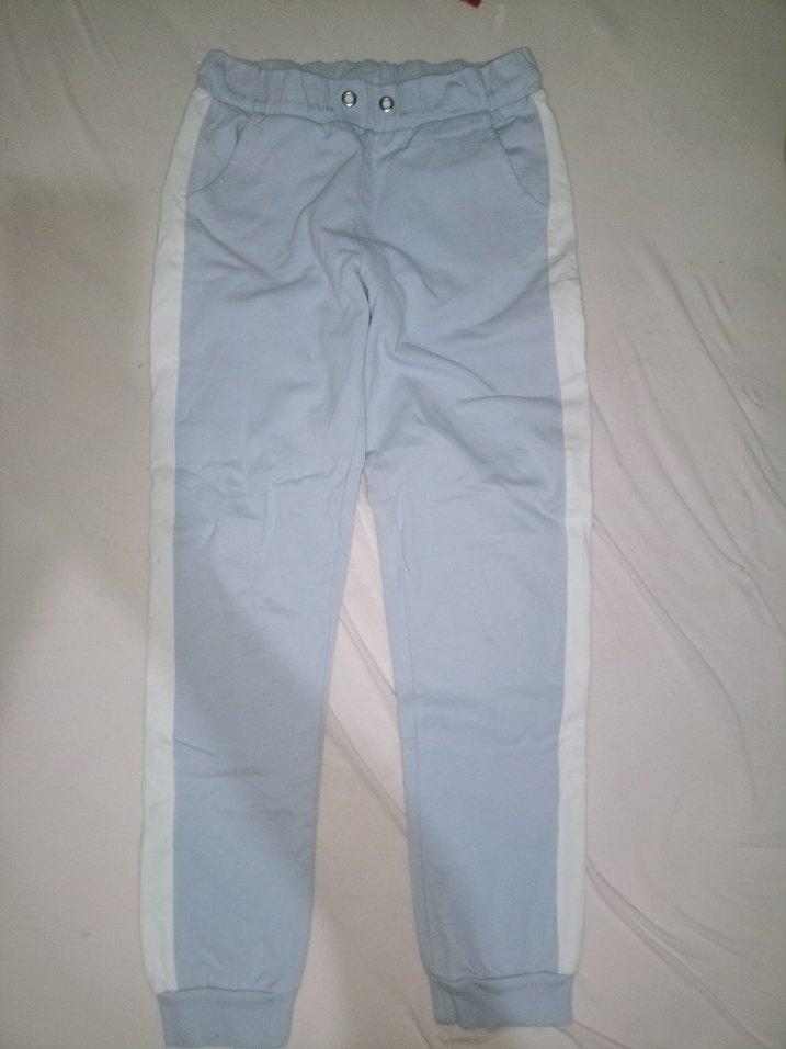Erkek çocuklar için regular fit, pastel mavi renkte, elastik bel bantlı pantolon. Yumuşak sentetik kumaştan, beyaz yan şerit detaylı, sade tasarım.