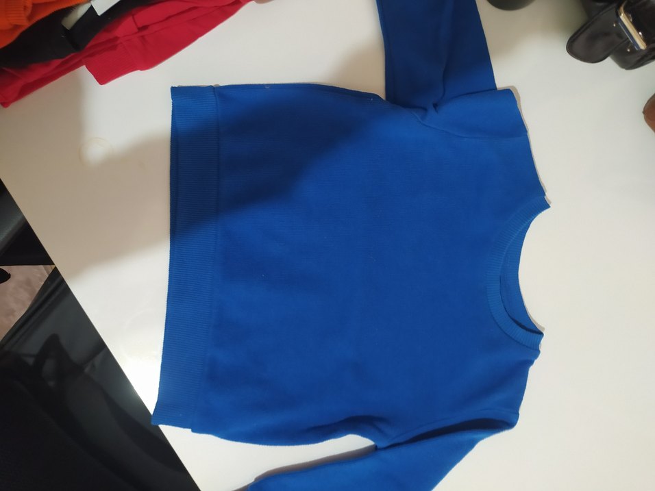 Parlak mavi ve turuncu renkte, yumuşak ve sıcak kumaştan, bisiklet yaka ve uzun kollu, dar kesim erkek çocuk sweatshirt. ✨