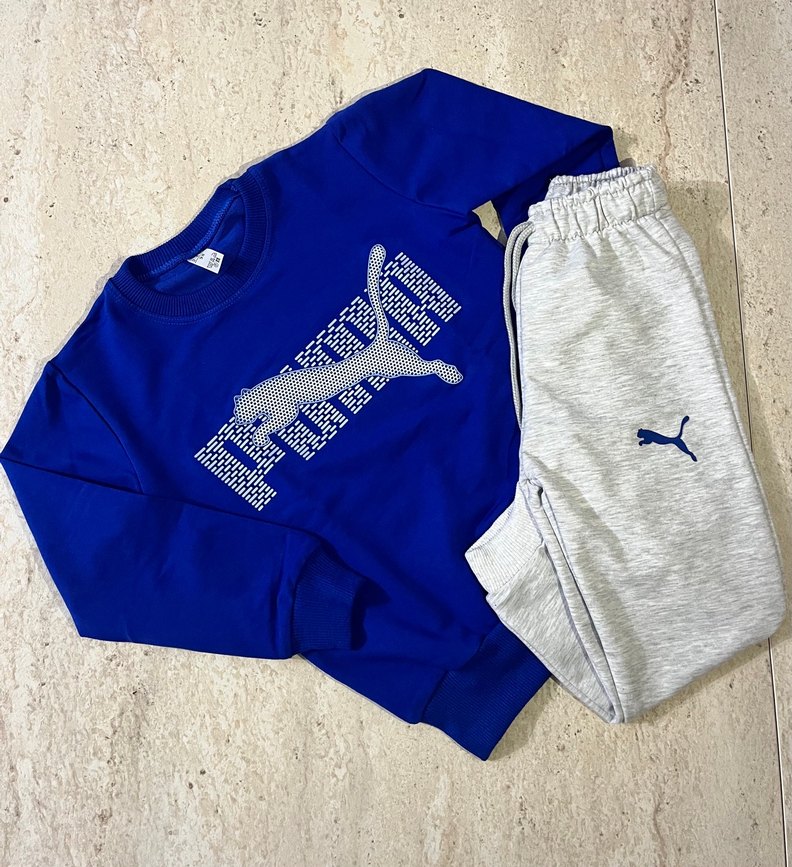 Erkek çocuklar için mavi baskılı sweatshirt ve gri eşofman altından oluşan, rahat kesim ve yumuşak kumaşlı takım. Sokak stiline uygun, konforlu ve şık.