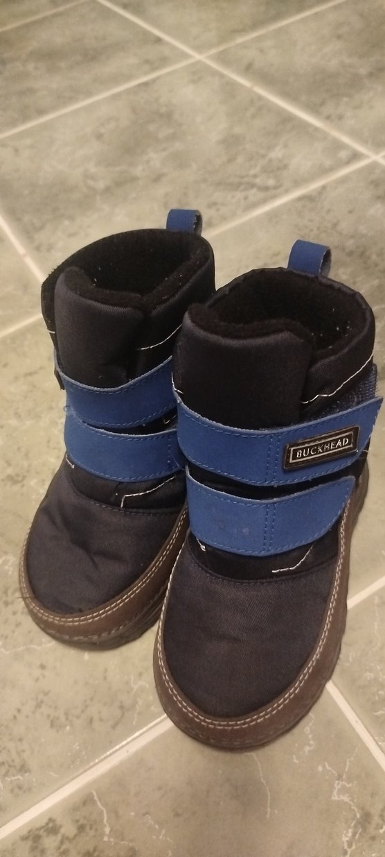 Erkek çocuklar için koyu mavi kauçuk botlar, tokalı kayışlara ve sokak stiline sahiptir. "BUCKHEAD" etiketi bulunur, trend casual görünümdedir.