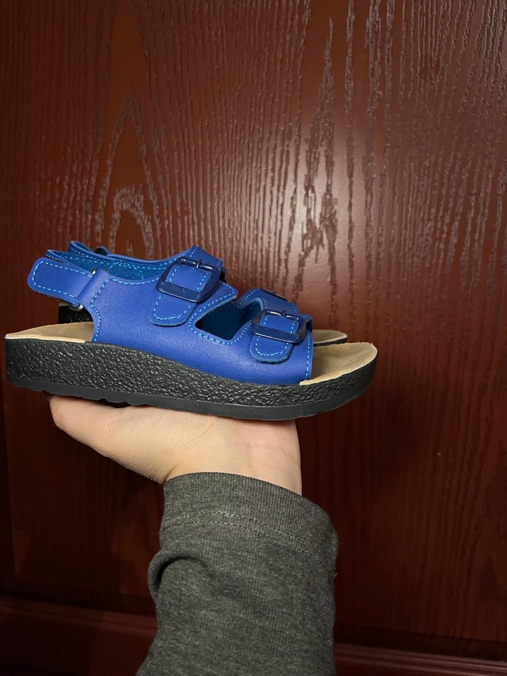 Erkek çocuklar için koyu mavi renkli, tokalı ve kauçuk tabanlı rahat terlikler.