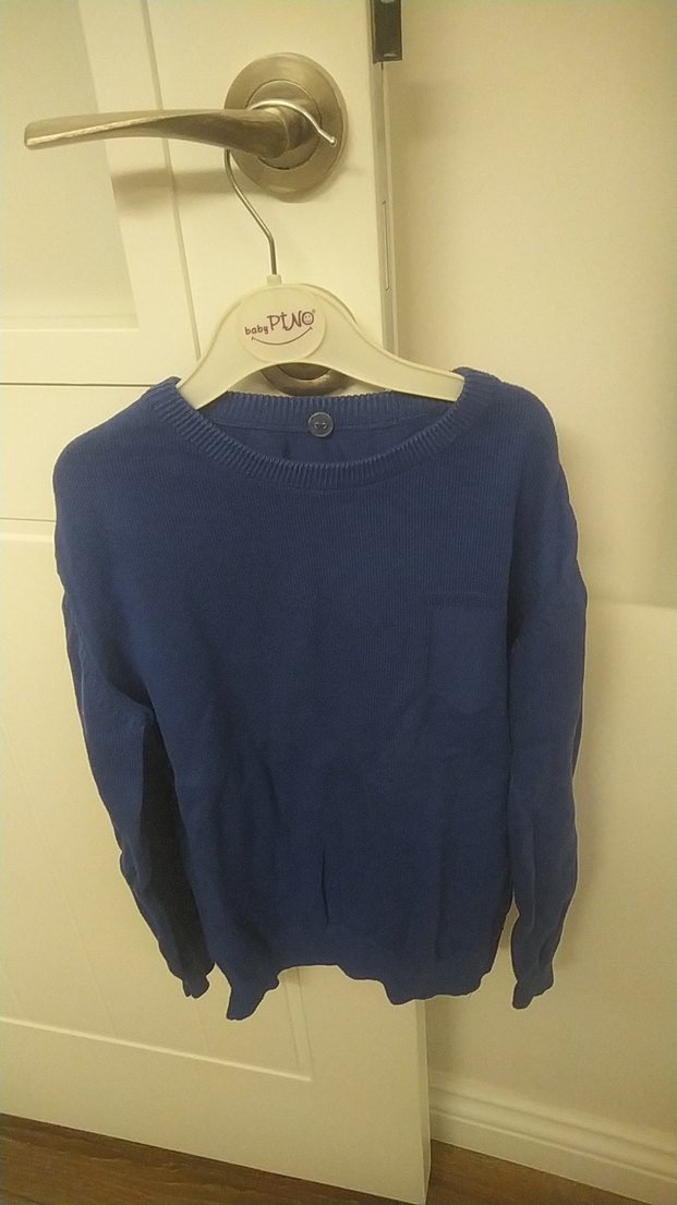 Erkek çocuk için yuvarlak yaka, uzun kollu, rahat kesim mavi triko sweatshirt. Yumuşak ve sıcak kumaştan örülmüştür.