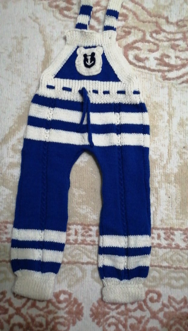 Açık mavi renkli, örme kumaştan erkek çocuk tulumu, kolsuz ve fitted kesim, çizgili desen ve denizci çapa detayı ile.