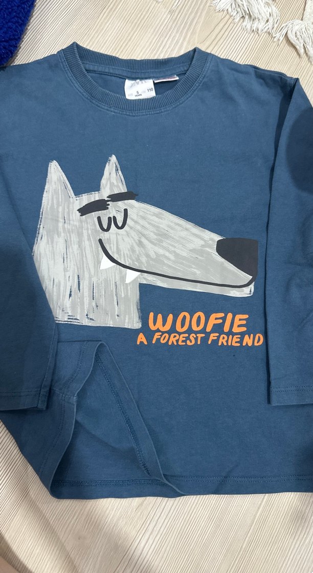 Erkek çocuk için mavi, uzun kollu, bol kesim sweatshirt. Yumuşak ve sıcak kumaştan, orman dostu baskı ve kürk detaylıdır.