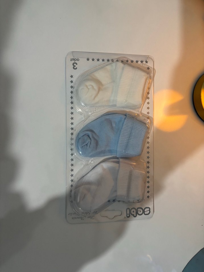 Erkek çocuklar için açık mavi ve beyaz renklerde, yumuşak ve rahat kumaştan, lastikli bilek kısmına sahip üçlü çorap seti.