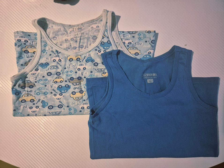 Erkek çocuklar için, biri düz mavi ve araç desenli 2 adet kolsuz atlet. Yumuşak pamuklu kumaştan üretilmiştir. 3-4 yaş