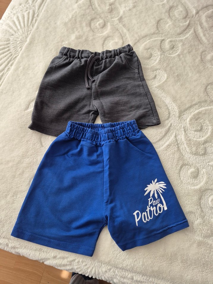 Erkek çocuklar için mavi ve gri baskılı, bol kesim şortlar. Rahatlık sağlayan lastikli bel ve yumuşak polar kumaş kullanılmıştır.