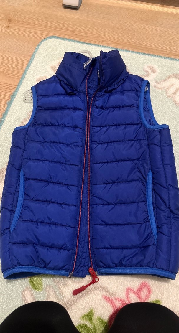 Erkek çocuklar için yüksek yakalı, fermuarlı ve yumuşak kumaştan üretilmiş mavi renkli, kolsuz, dar kesim yelek.