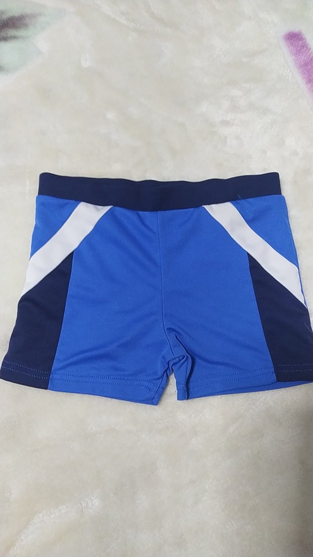 Erkek çocuklar için mavi, lacivert ve beyaz detaylı, suya dayanıklı hızlı kuruyan kumaştan yüzme şortu.