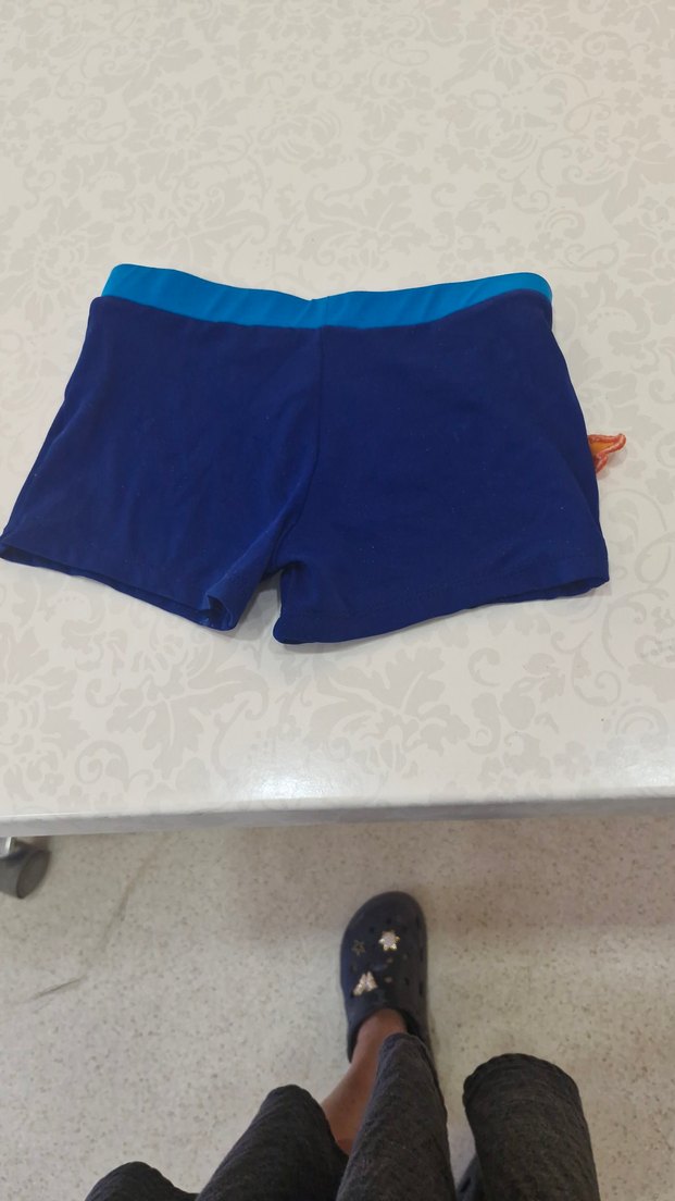 Erkek çocuklar için mavi renkli, renkli bel bandına sahip yüzme şortu. Desensiz ve rahat bir yapıya sahiptir.