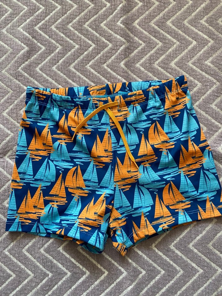 Yaş 11/12, iki defa kullanıldı, yelkenli desenli erkek çocuk mayo şort, ayarlanabilir bağcık ve hızlı kuruyan kumaşa sahiptir, plaj patik ile birlikte