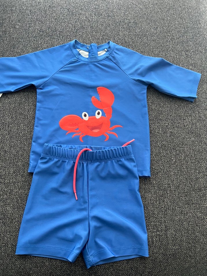 Erkek çocuk için kısa kollu, renkli yengeç baskılı mavi mayo üstü ve ayarlanabilir bel bantlı mavi şort takımı. 2 gün giyildi sadece sorunsuz
