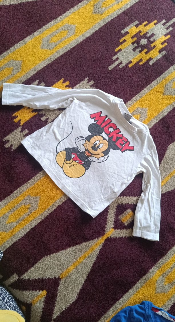 Erkek çocuklar için pamuklu, örme dokulu ve bol kesim uzun kollu tişört. Önünde renkli Mickey baskısı ve boğazlı yaka bulunur. Sokak stili için uygundur.