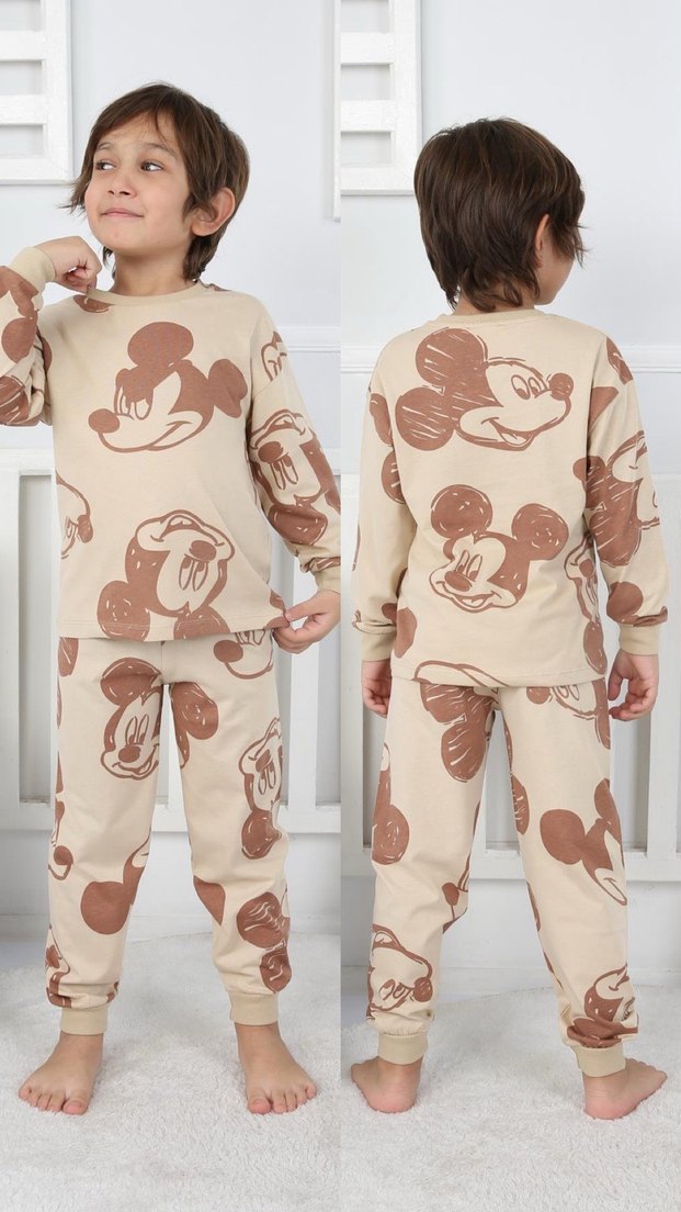 Uzun kollu, yuvarlak yaka ve bol kesim erkek çocuk pijama takımı, açık kahverengi Mickey Mouse baskılıdır. %100 cotton pamukludur. 3-4/4-5/5-6/6-7/7-8 yaş mevcut