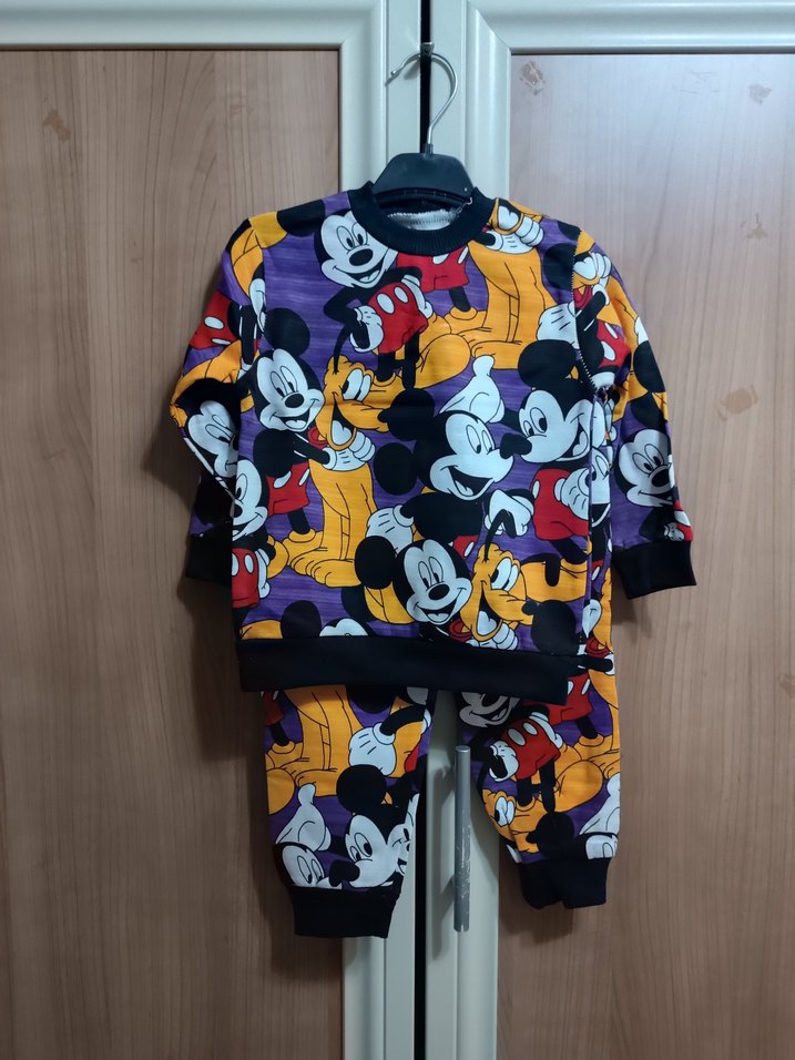 Erkek çocuklar için bol kesim, uzun kollu ve bisiklet yaka sweatshirt takımı. Yumuşak kürk dokulu kumaş, renkli Mickey Mouse baskısı ve örme detaylarla dikkat çeker.