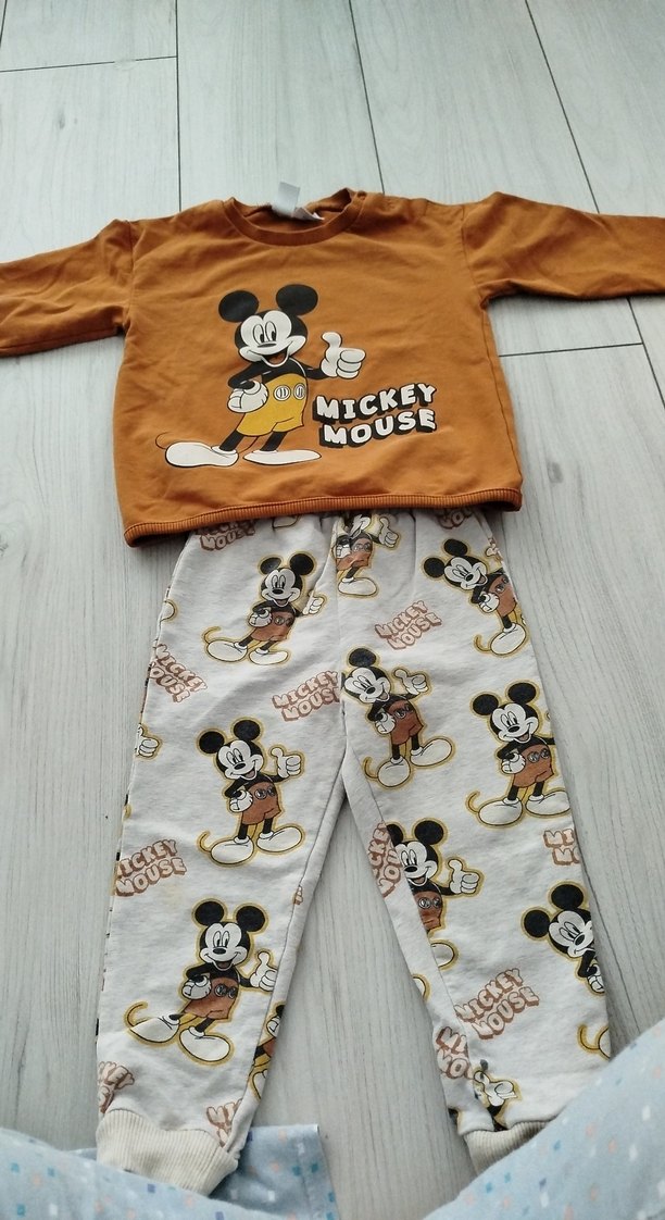 Bol kesim, kahverengi bisiklet yaka üstte büyük Mickey Mouse baskısı bulunur. Altlar gri renkli, Mickey Mouse desenlidir. Yumuşak, örme tüylü kumaştan üretilmiştir.