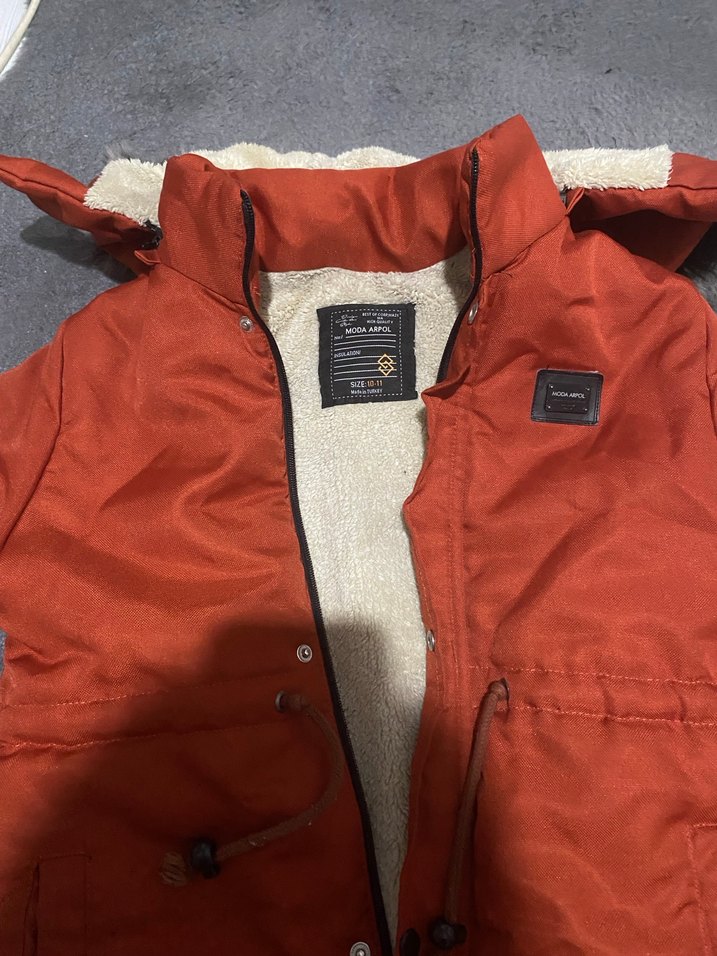 Kahverengi, parlak renkte, baskılı desenli, uzun kollu, fit kesim midi boy mont. Kürk detaylı ve yumuşak iç astarlı, günlük kullanıma uygun. Hiç kullanılmamıştır Bedeni 10/11 yaş Kapşonu fermuarlıdır