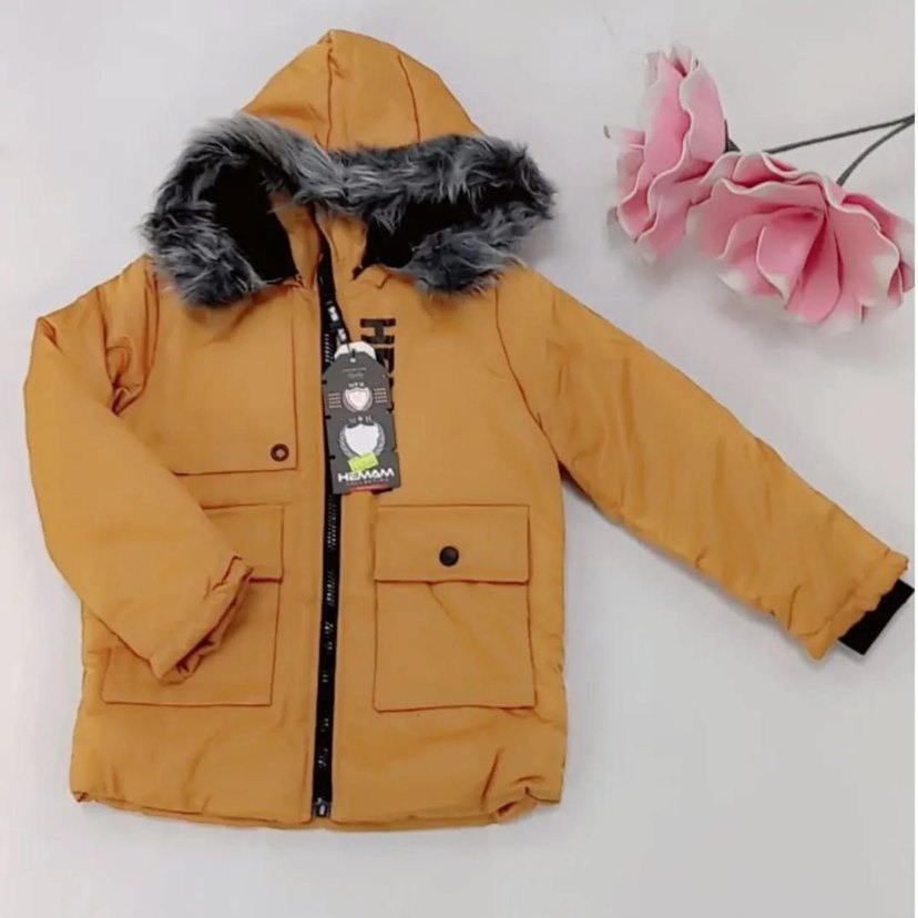 Kahverengi erkek çocuk montu, kürklü kapüşon ve rahat kesim ile yumuşak kumaştan üretilmiştir. Ön cepler ve renkli baskı detayları bulunur.
