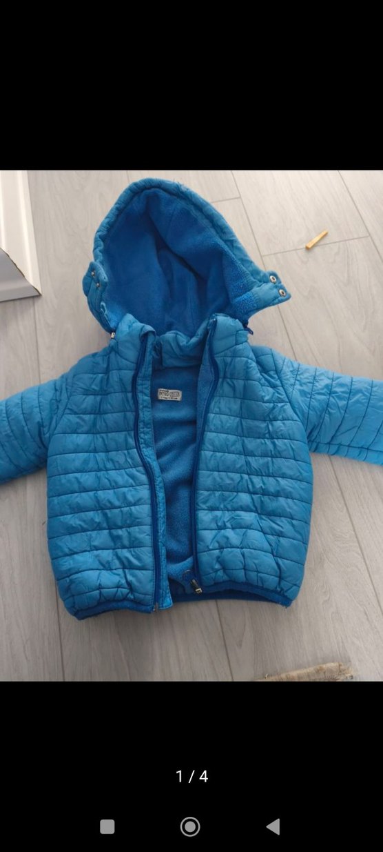 Mavi renkte, kapüşonlu ve fermuarlı, yumuşak ve sıcak kumaştan yapılmış erkek çocuk montu. Sokak stili için uygun, sade tasarım.