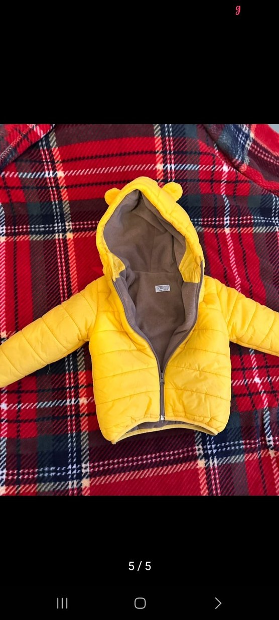 kapüşonlu, ayıcık kulaklı ve fermuarlı, yumuşak ve sıcak kumaştan yapılmış sarı mont. 2 3 kere giyildi yeni gibi.