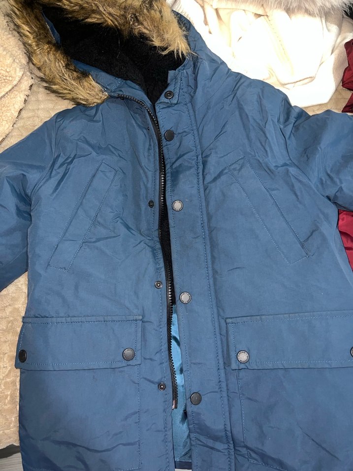 Koyu mavi renkli, kürklü kapüşon ve keskin yaka detaylı, yumuşak ve sıcak kumaştan yapılmış hiç bi sorunu yok