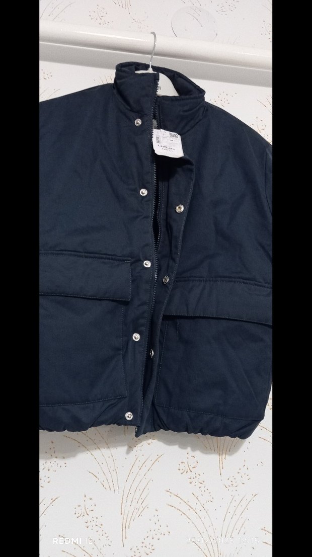 Düğmeli, yakalı ve kısa kollu lacivert erkek mont. Bol kesimi ve yumuşak, sıcak kumaşıyla dış mekan kullanımı için uygundur. sıfır üründür