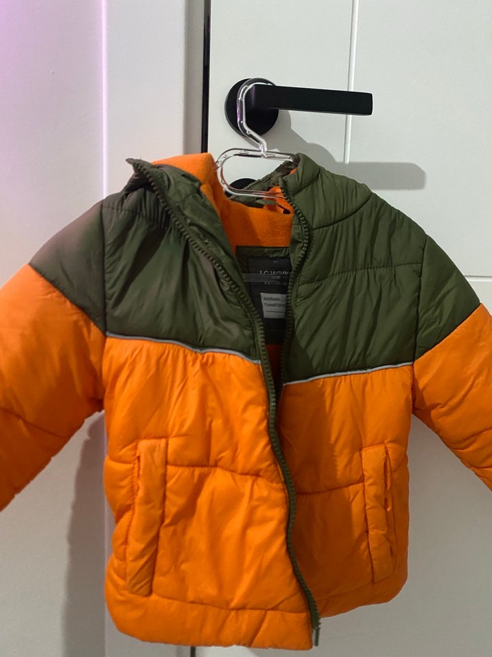 Fermuarlı ve yaka detaylı, turuncu ve yesil renklerde, sıcak tutan kumaştan yapılmış erkek çocuk montu. Streetwear tarzında, dar kesim.