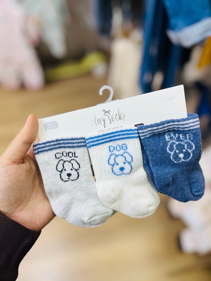 Gri ve mavi tonlarında, nakışlı köpek desenleri ve "DOG" ile "COOL" yazılı 3'lü erkek çocuk çorap seti.