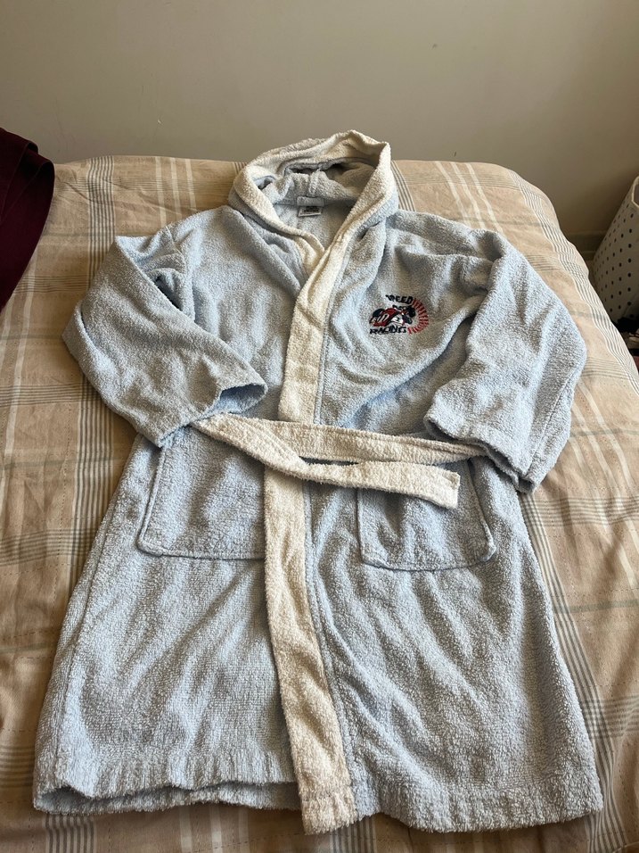 Mavi renkli erkek çocuk bornoz, nakış detaylı ve yumuşak, emici kumaşa sahiptir. Belden bağlıdır.
