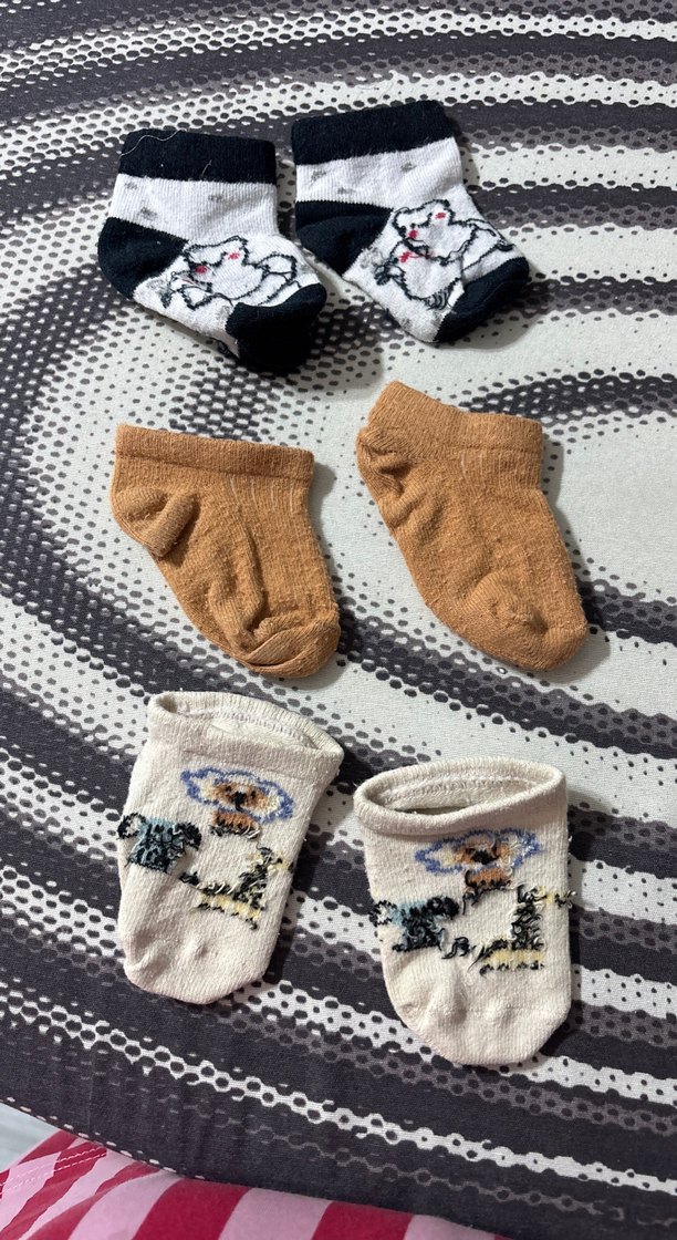 Nakışlı desenlere sahip, koyu kahverengi ve krem renklerinde üç çift erkek çocuk çorabı. Yumuşak ve rahat yapıda. 0-6 ay